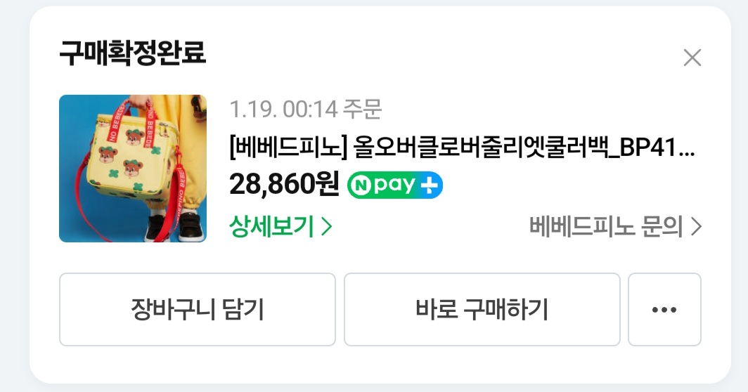 원래 집에 있는 쿨러백이나 아이스박스들이 다 큼직해서, 간식 몇 개나 과일 정도만 간단하게 넣고 다닐 수 있는 작고 예쁜 쿨러백이 필요했거든요. 그러다가 베베드피노 공홈에서 세일 중인 걸 발견! 정가는 무려 59,000원이지만, 저는 운 좋게 28,860원에 득템했답니다.